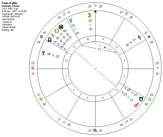 Let’s continue with Alcyone and the Pleaides, now applied to the chart of Frida Kahlo (1907-1954), a painter from Mexico who had some international success, whose life has become better known and her art more admired over the past few decades than during her lifetime.