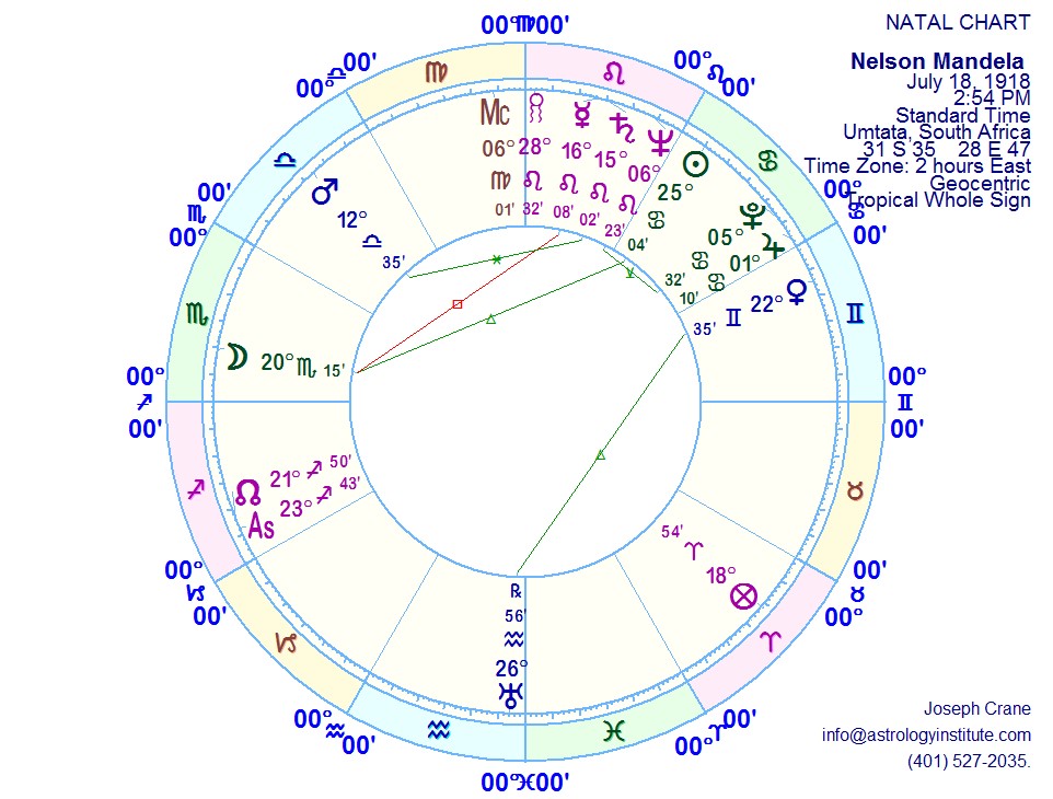 Astrologers who use a quadrant house system (e.g., Placidus, Koch) may find Jupiter in the Seventh Place, not the Eighth. For a man who spent twenty-seven years in prison, I am not surprised by seeing the Sun and Moon along with the ruler of the Ascendant in Mandela’s Eighth and Twelfth Places. It well befits someone whose calling required had a great personal sacrifice; the chart of a fortunate man would not be that of Nelson Mandela.