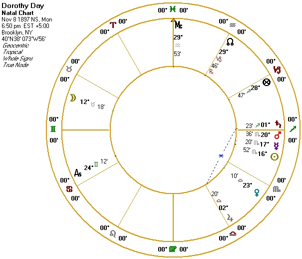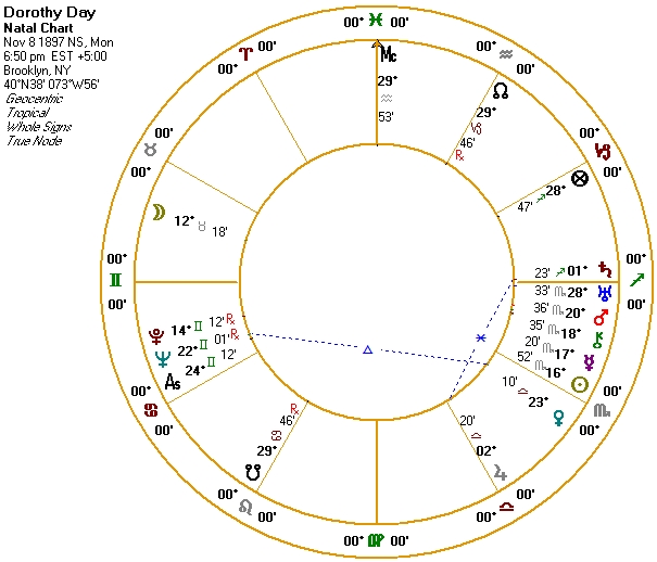 One detects a strong idealism in this Jupiter placement, especially since Jupiter’s dispositor is Venus in the same sign. Day’s advocacy of pacifism (especially during World War Two), distributism, with its longing for global spiritual regeneration, may strike the reader as sheltered in illusion. Yet she was not naïve, especially if we also include her willingness to go to jail in the expression of her positions (from a women suffrage demonstration in her youth to joining Cesar Chavez in the 1970’s to work for farm workers. As the ruler of both Lots of Fortune and Spirit, Jupiter has had much to do with the many phases of her life and the strong choices she made.
