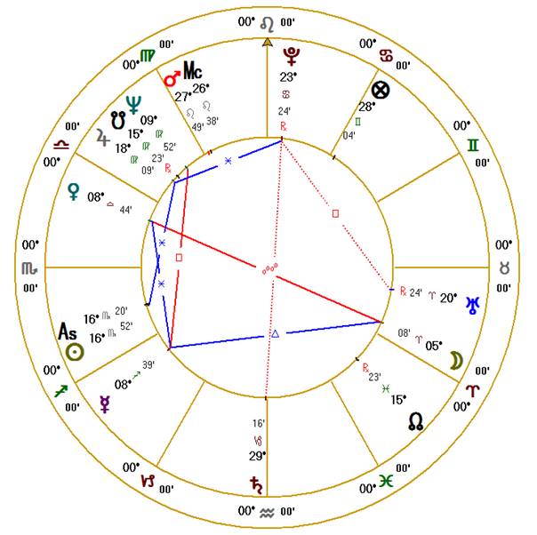 Here’s her chart with the outer planets. Pluto and Neptune are both in her First House. Especially important is Neptune’s close conjunction with her Ascendant degree and its close trine to Venus. If it was Mercury with Neptune she would have been more ideological and less personal; the presence of Venus allowed the Neptune idealism to be more personal and more compassionate.