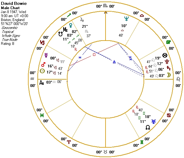 A chart with Aquarius rising has Saturn as the ruler of planets in both the Twelfth and First houses and dispositor for any planets in these houses. In Bowie’s chart Saturn is in Leo, in detriment, also in the Seventh House of relationships. (Does that mean that Sun in Capricorn have a mutual reception with Saturn in Leo? I think not, since the signs Capricorn and Leo are signs that are disconnected to one another.) Saturn is in the Seventh: it is through relationships, if at all, that the planets in the Twelfth can best manifest.