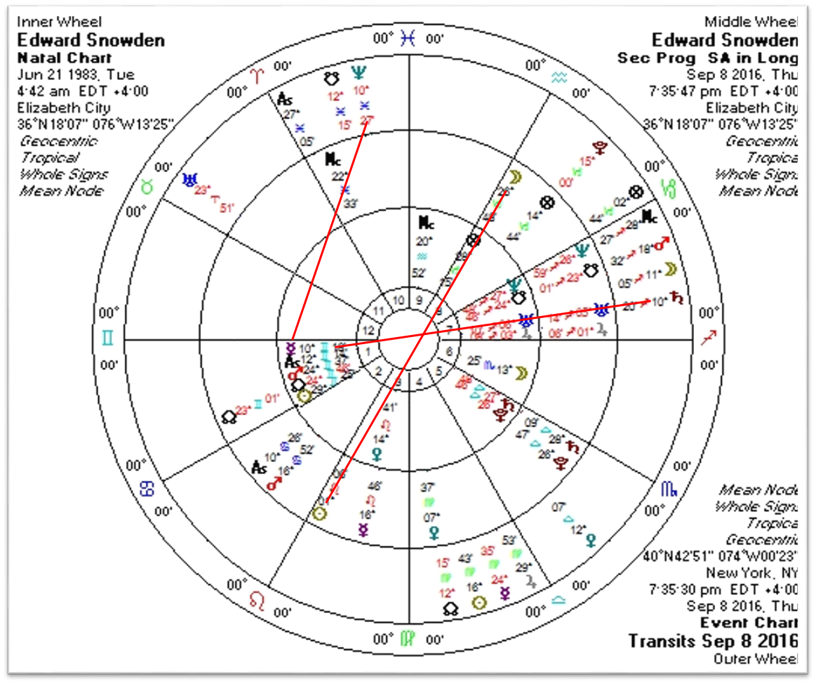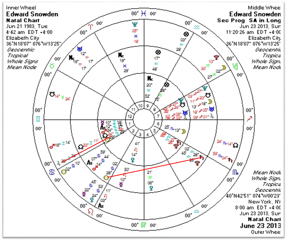 At this time moment don’t look terribly encouraging for Snowden, if you just look at his transits.  The ugly Saturn-Neptune square is transiting his natal Mercury, to the degree, right now; Saturn will move on toward his other planets in Gemini but Neptune will continue to be in opposition to Mercury until February 2017.  Mars, currently in its transit through Sagittarius, has been in opposition to all his planets in Gemini.