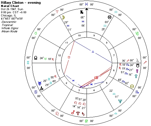 Instead we begin with Mars, the traditional ruler of Scorpio. Hillary’s Mars in Leo and the Sun in Scorpio are in each other’s ruling signs, a strong mutual reception that augments a Mars-like personal style.  Ordinarily Mars affiliated with Scorpio yields a quiet fighter, one who keeps the sword in the sheath except for when it is to be used, and when used the sword has strength and accuracy, and then gets put away.  Nobody has confused Hillary’s reticence and secretiveness for passivity.