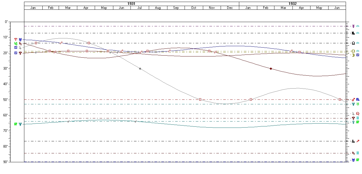 As most of us now know well, a Uranus-Pluto square can last several years and impact one’s natal planets for a long time. In the early 1932’s Uranus was in Aries and Pluto was in Cancer and were in square during much of that time.