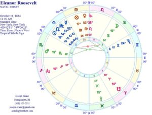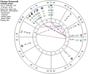 Now that we have closely examined the visible planets we see how Uranus, Neptune, and Pluto add to what we know. Pluto tells us more about Roosevelt’s Venus placement, as Pluto in the Seventh House is in square to Venus; this helps accounts for her husband’s infidelity and further indicate her responses to that. Any extracurricular relationships would occur with the greatest discretion. On the mental side, Pluto is in close trine with Mercury, adding an intensity and depth to her speaking and writing and to how her mind operates.