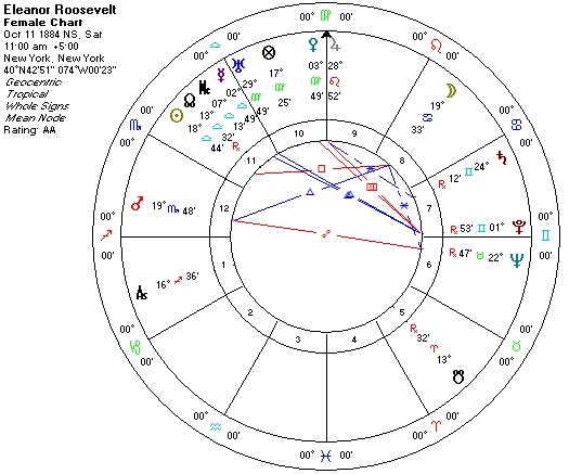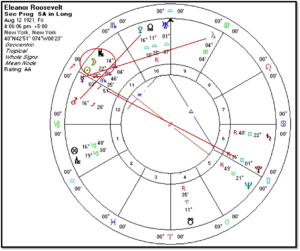 With Sun in Libra in square to Moon in Cancer, Eleanor Roosevelt was strongly affected by transits of Uranus and Pluto. This