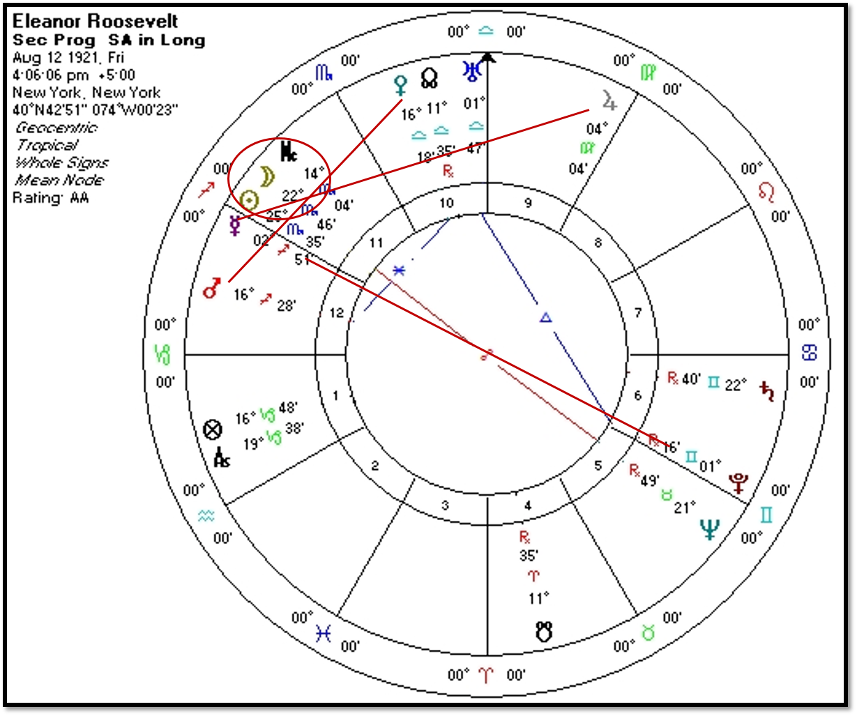 Then, in the autumn of 1921, shortly after Franklin’s polio collapse, she had a Progressed New Moon that would launch a new and long-lasting phase of her life. This was followed by two progressed aspects becoming exact: Venus sextile Mars at the end of 1921 and Mercury square Jupiter in mid-1922, signifying for her increased public presence outside the home, despite her attention turned toward caring for her ill but still ambitious husband.