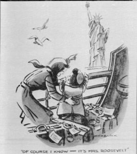 As World War Two approached, the movement of refugees from Europe, particularly Jews fleeing Hitler, emerged as an issue of contention. It’s easy to forget the anti-Semitism present in the United States at that time, including in the State Department. Although she had some success she lost this battle as well – to this country’s subsequent embarrassment and shame. The same pattern emerged when World War Two erupted and people of Japanese origin were sent to internment camps for the duration of the war. Eleanor Roosevelt strenuously objected to this and made it a point to visit people confined to these camps.