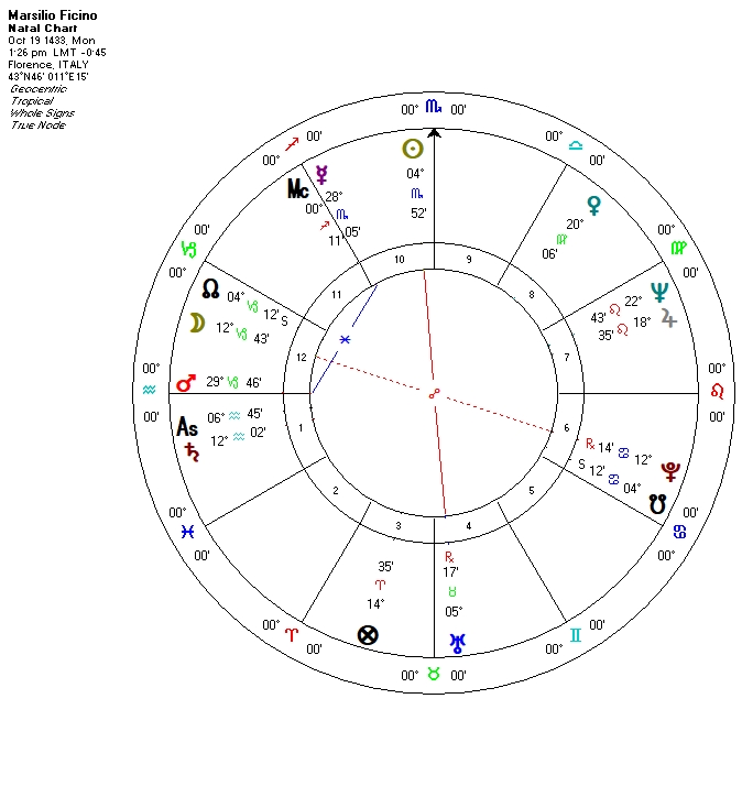 Ficino’s Saturn in Aquarius is in its own sign and its own triplicity, since he was born during the daytime, with the Sun above the horizon.  Because of the strong position of Saturn, Ficino stood a strong chance to embody the saturnine virtues of hard work, patience, strong self-definition and focus. Saturn also gave him a more conservative character than many of his younger followers.