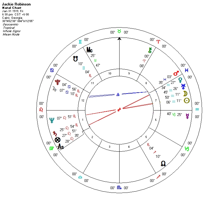 Using the ancient technique of decennials adds nicely to this picture.  Robinson’s general and specific chronocrators or planetary lords were Mars-Mars beginning in 1940 when he was 21 and a star athlete at UCLA.  His time in the army, however, happened under Mars-Saturn that ended almost exactly after he left the military.  Following was Mars-Mercury and his career in baseball to the summer of 1946; when we look at his style of playing baseball, with his genius for base-running, we note his strong intelligence about the game.  This leads to Sun taking over as his specific planetary lord from 1946 until the winter of 1948, catapulting Robinson into lasting fame and a place in history.  For him this was an Aquarian accomplishment, not about him but about the society around him,