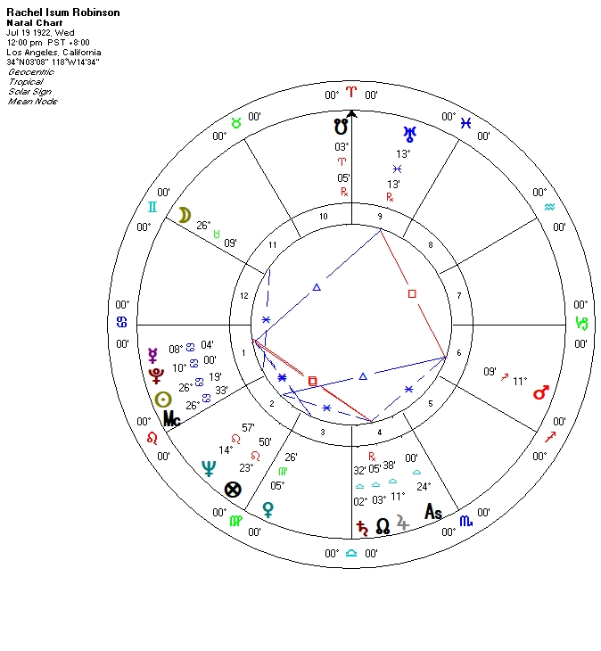 Jupiter, going through Libra, would make a transiting square to his Mercury in Cancer during the winter of 1946, the time of his marriage to Rachel Isum: considering the strong Mercury-Jupiter contacts between their two natal charts, this was an auspicious time for the young couple.