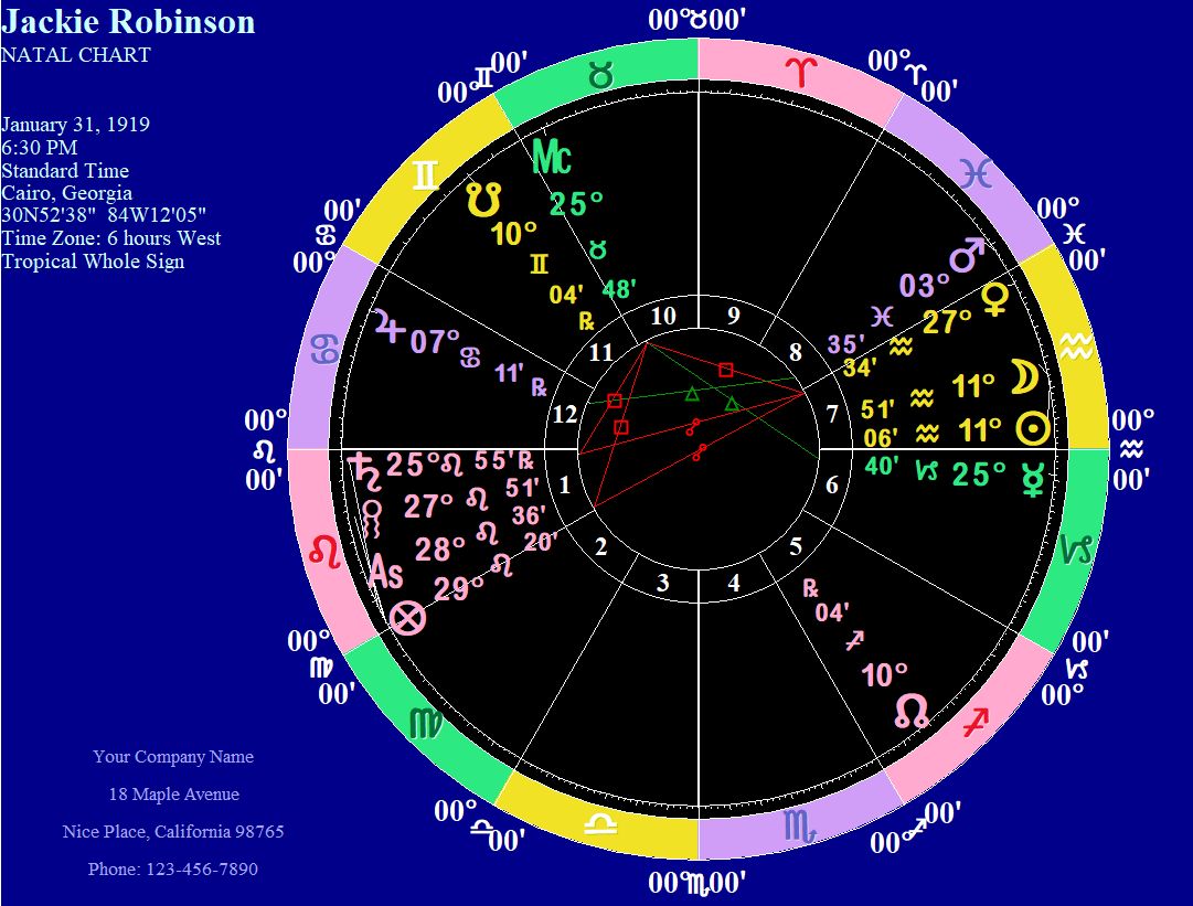 Jackie Robinson’s astrological chart not including outer planets. Click to open in new window.
