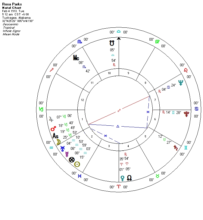 These days modern psychologists have been studying “true grit”, a combination of personal qualities that are strongly correlated with achievement.  True Grit consists of self-control plus perseverance, the ability to stay focused and to continue regardless of obstacles and setbacks.  Yet these qualities do not exist in a vacuum even if they well-supported in an astrological chart.  To flourish in life, to approach our own greatness, we depend on a sense of larger purpose and a supportive surrounding community of some kind.  Jackie and Rachel Robinson and Rosa Parks surely had these qualities and so did those around them.
