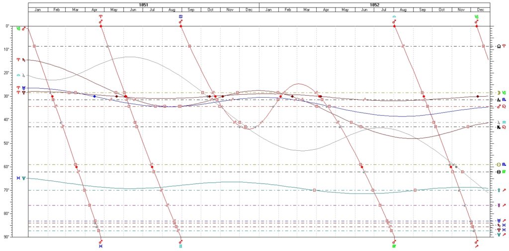 And, to continue this astrological onslaught, transiting Neptune in Pisces was in square to natal Venus in Sagittarius from spring 1852 for about nine months. This could have produced the “love of her life” or grand deception in matters of love. (Fortunately it turned out to be the former.)
