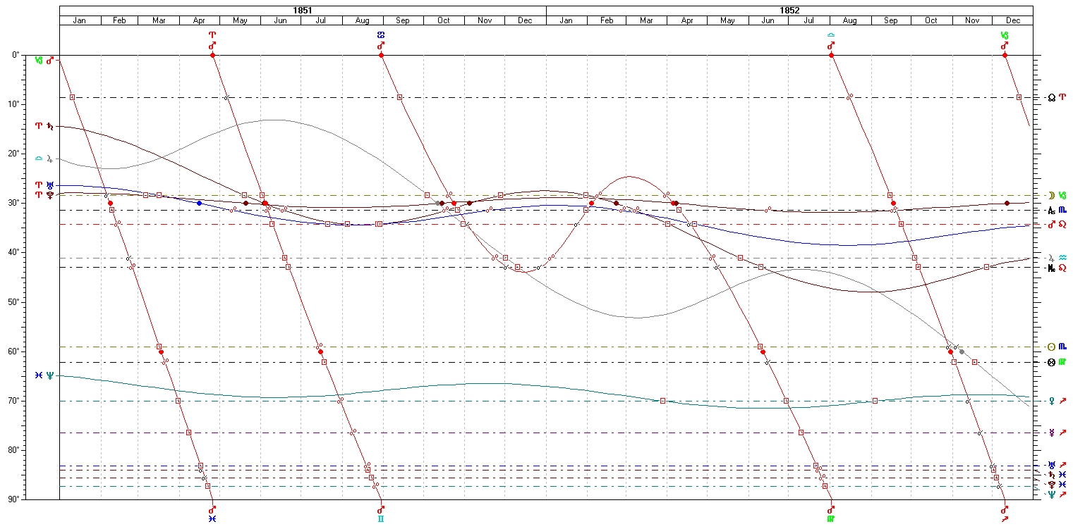 Her transits during this time are rather conspicuous. The graphic ephemeris here shows a conjunction of Uranus and Pluto in late Aries and then early Taurus that would first square her Moon, oppose her Ascendant, and finally Uranus would square Mars. Pluto spent a very long time (until spring 1854) going back and forth opposing her Ascendant.