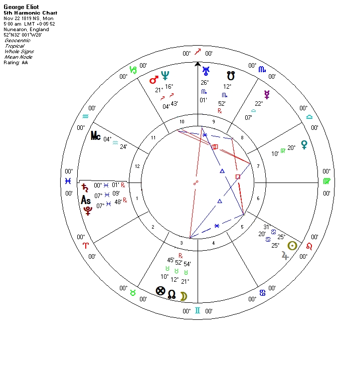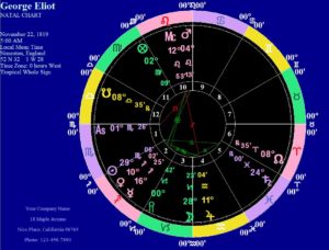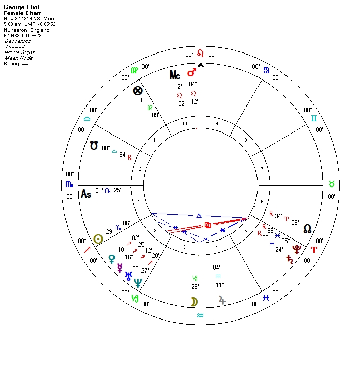 Contrasting is Mars in Leo in the Tenth that gives a flair for the dramatic on a public stage. A Mars-like public presence could have worked well for a man during her lifetime or (maybe) for a woman politician during ours. However, Evans/George would have encountered a severe “likeability” problem had more of her true voice been public and she communicated with the public through her writing. Mars displayed itself in her an independent career, earlier as a scholar and later as a novelist. (Happily for the history of the English novel, her partner acted as her literary agent and recruited a sympathetic publisher for her work. With Mars in Leo it still took a village.)