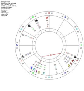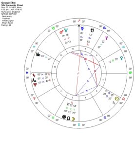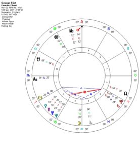 Applied to Evans’/Eliot’s life, the conjunction with Pluto brought a strong dose of intensity and austerity and the squares from Uranus and Neptune added an unorthodox vision – at least compared with the Victorian tenor of her times. Configured with all three outer planets, Saturn also provided a modest and earth-bound opening to the transpersonal.