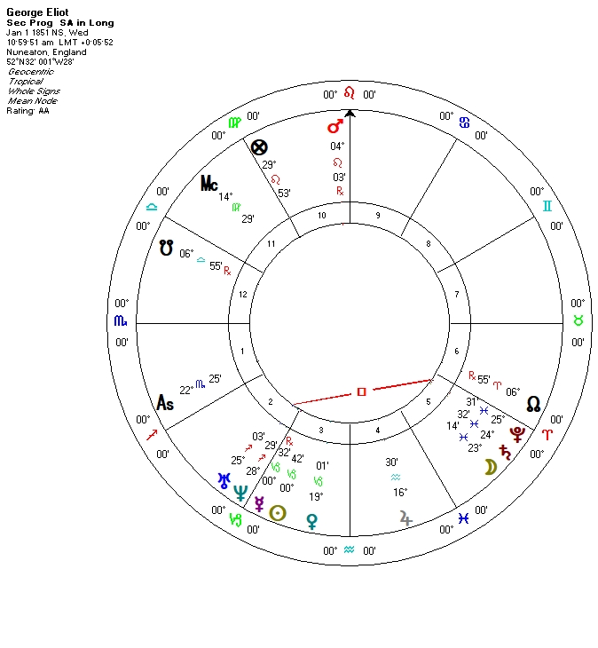 Looking at Eliot’s decennials, autumn 1851 had begun a Moon period, with Moon-Moon in play until that autumn when it changed to Moon-Jupiter. This emphasized emotional life in abundance.