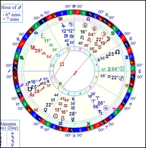Jupiter in Virgo governs her Ascendant and is the planetary dispositor for Mars. Although in the powerful Tenth House, Jupiter here is wholly out of sect (a diurnal planet in a nocturnal chart, in the “feminine” sign Virgo), and is in detriment in a sign known for fussiness and shortened conceptual horizons. Ancient astrologers would note a dominating square from Jupiter to Mars, signifying that the large planet calls the shots over the red planet. This effect would be stronger for Jupiter being in the Tenth House.