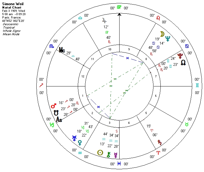 An essentially dignified Moon, also wholly in sect, may correspond with Weil’s desire to experience the lives of others, not just to think or write about it. This brought her to activity beyond her physical or emotional tolerance level – as a factory worker, as a soldier in the Spanish Civil War, and, unsuccessfully, to propose to parachute into Nazi-occupied territory, even be a front-line nurse on the battle front. To use Tennyson’s line about Ulysses, she endeavored to become part of all that she met.