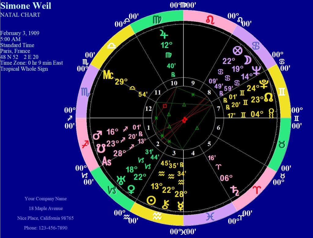 When Simone Weil was born, her Ascendant was in the last degrees of Sagittarius, at the ecliptic’s most southern area of the sky, close to overhead on the latitude of the Tropic of Capricorn. In the Northern Hemisphere, the distance between the rising degree and the culminating degree (the Midheaven) is small, especially forty-nine degrees north of the equator, and in Weil’s chart the distance is a bit less than sixty degrees. In this case, using Whole Sign Houses, in which the entire sign Sagittarius is the First House and so on in the order of the zodiac, results in planet placements very different from “quadrant” house systems such as Placidus or Koch. My work over the years has shown me that Whole Sign Houses give a clear and accurate picture of what one carries into a lifetime. This is especially so when we look at this woman’s astrological chart.