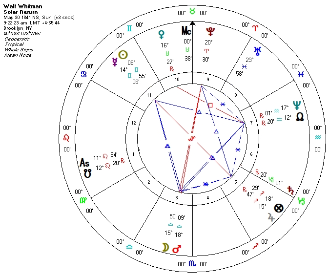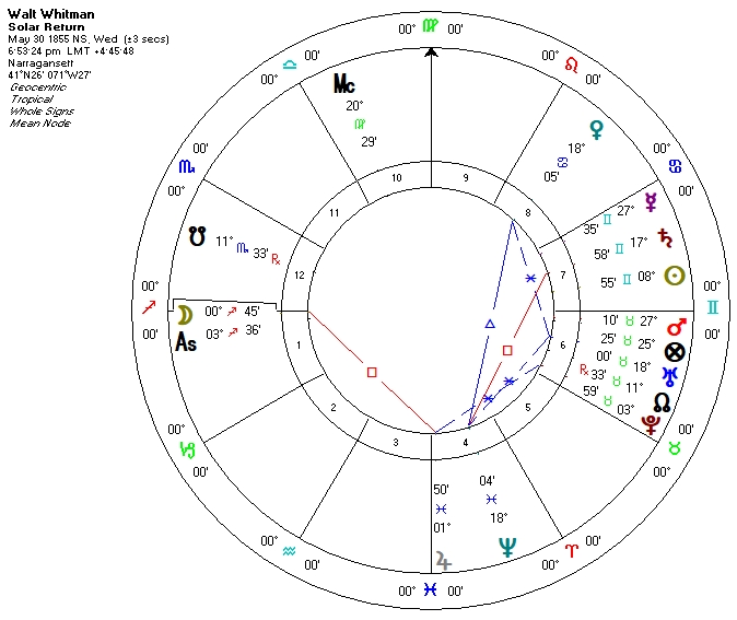 Whitman’s solar return for this year shows enhanced personal expression but not exactly fame. Note Moon rising in Sagittarius strongly connected to Jupiter in its nocturnal sign Pisces. This shows more of a personal than a public presence.
