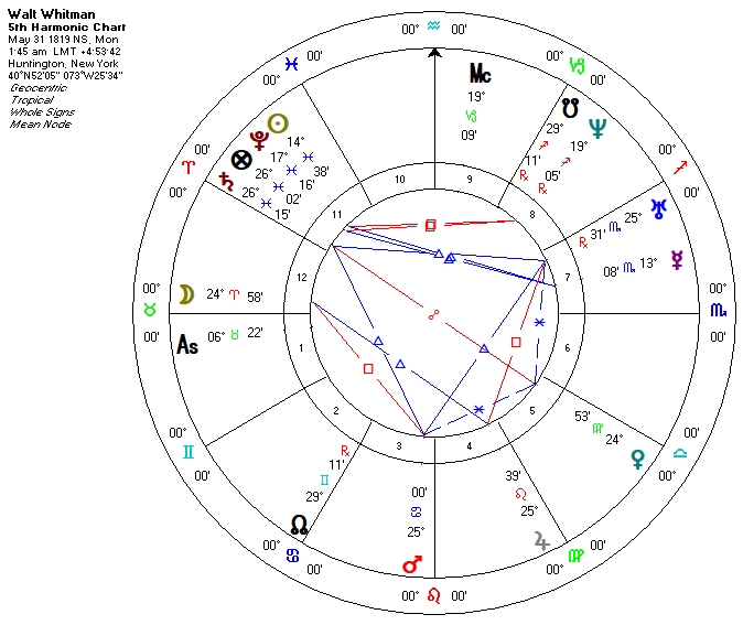 Whitman’s Fifth Harmonic chart shows the influence of the aspect of the quintile in his chart. We see Saturn with greater prominence, as it forms aspects to Uranus, Venus, and Mars. Whitman could be very disciplined and focused in accord with his own agenda. We also see a strong Sun-Mercury trine (twenty-four degrees away from each other) that gives further testimony to his interest in words and communication for self-expression – in his own unique way
