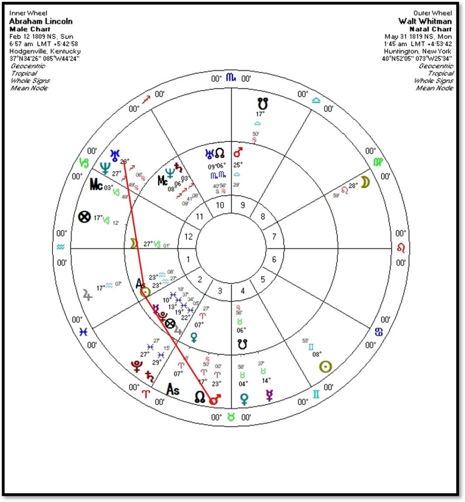 Is there an astrological relationship between Whitman and Lincoln? The birth time for Lincoln is given as “around sunup” and his chart has been rectified to place both Sun and Ascendant at twenty-three degrees of Aquarius, in sextile to and bisecting Whitman’s Mars-Uranus trine. It was through Lincoln’s life that Whitman experienced the possibilities of worldly transformational leadership beyond the reach of an otherworldly poet.