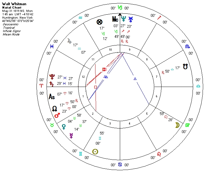 Mars placement takes a trine from Uranus, exact to the degree, and more distantly from Neptune, providing unconventionality and a strong dose of other-worldliness to his Mars placement. Yet these qualities were not naïve, for we find that Uranus/Neptune are also in square to a combination of Saturn and Pluto in the Twelfth House. (We also find from his Saturn-Pluto in the Twelfth House a poetic depiction of the intensity and variety of human suffering, especially in “Song of Myself” and his Civil War poetry.)