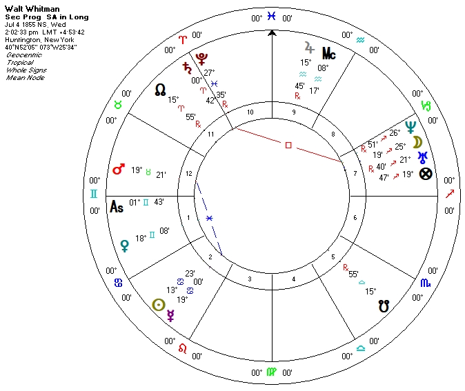 Whitman’s secondary progressions show a more permanent change in life. For starters, exact in October of the previous year progressed Mercury was in sextile to progressed Mars that could show strong intellectual activity or communications; this aspect continued to operate through the publication of his first edition.