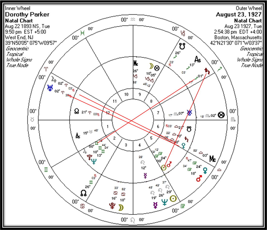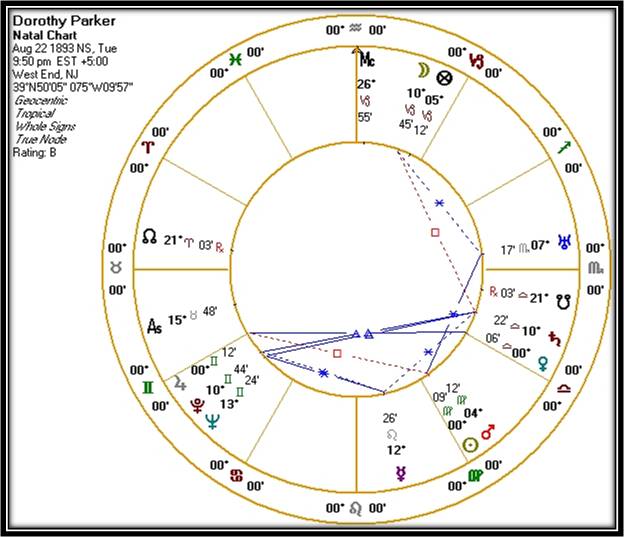 Given all this, what would an astrologer ask of her chart? One would look for indicators of her unique literary and epigrammatic genius. One would also look for her political transformation and subsequent life as an activist, also her penchant for sexual expressiveness, alcohol excess, and self-destruction in general. Parker’s birth chart is a thing of beauty and rewards close attention to these and other issues.