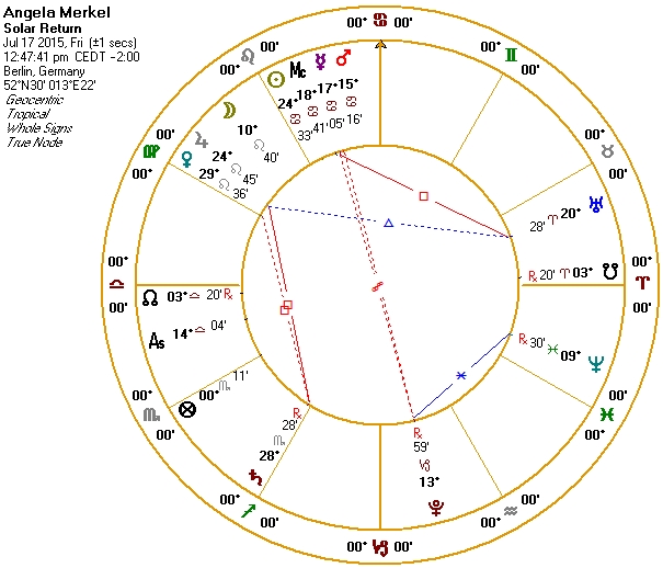 Here’s her solar return for 2015 and it’s hard not to notice that most planets inhabit the Tenth and Eleventh Houses that, for a national leader, impacts not only her own prominence but her standing among other world leaders. The “Ruler of the Year”, the planet who governs her profected Ascendant, is Jupiter in Leo and in the Eleventh House, its “House Joy”. Uranus makes aspects to both Jupiter and Sun and makes Merkel capable of all kinds of surprises. She’s by no means finished with them.