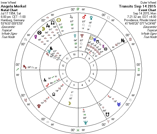 Her year 2015 brought her to new prominence on the international stage. Diplomatically she has become a third factor in the increasingly adversarial relationship between the United States and Russia; she received much criticism for her brinkmanship with Greece as it was defaulting on debt repayment and contemplating leaving the Euro-zone; most recently she has opened the borders to waves of people fleeing Syria and Iraq. Her welcoming attitude toward those wanting to immigrate to her country earned her and her country considerable praise around the world – and some opposition in her own country. What’s her astrology like these days?